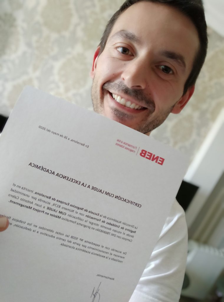 En Abril del 2019 me matriculo en el Máster en Project Management de la Escuela de Negocios de Barcelona, adscrita a la Universidad Isabel I de Castilla. No esperaba conseguir un hito así, pero entre las 11 asignaturas terminé con 9.82 de media, lo que me distinguió como el nº1 en mi promoción y obteniendo el certificado CUM LAUDE a la excelencia académica. Emocionado, termino matriculándome en el Executive MBA (junio del 2020) del mismo centro…